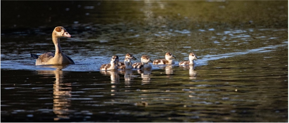 Further upstream an anxious Egyptian goose took her clutch of fluffy goslings for one of their first swims.