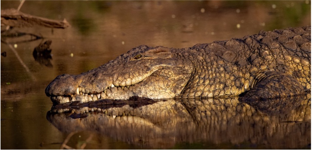 Shortly after seeing the hippos we spotted a large crocodile lying motionless and mirrored in the shallows, its rough hide blending perfectly with the muddy bank. Ancient and patient it was waiting for the day’s last warmth to fade before slipping without a ripple back into the river.