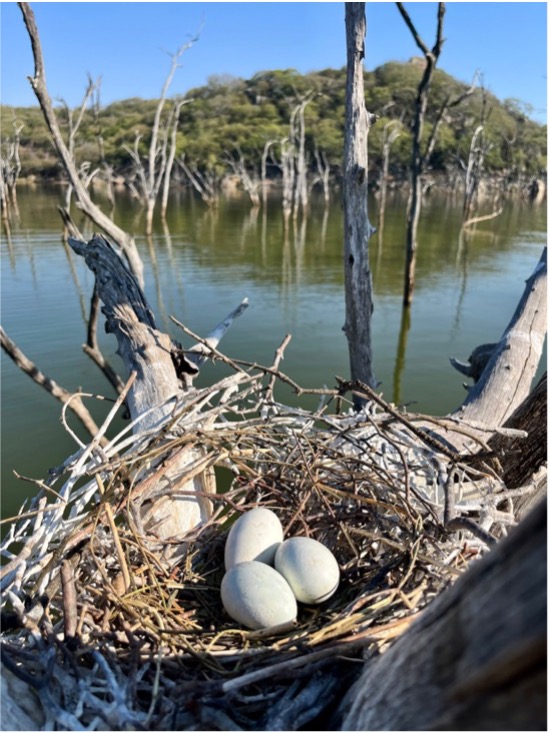 Our outing coincided with the nesting season of many birds. It was incredible to get a glimpse of these African darter eggs in a nest built in the fork of one of the dead trees that reach up out of the dam. The eggs had a pale green tint to them. Both parents share the incubation of the eggs, which lasts for about one month, and use their feet to warm the eggs since they lack a brood patch. There were several pairs tending their eggs, and the height of the boat as we went past a nest offered us this sneak peek.