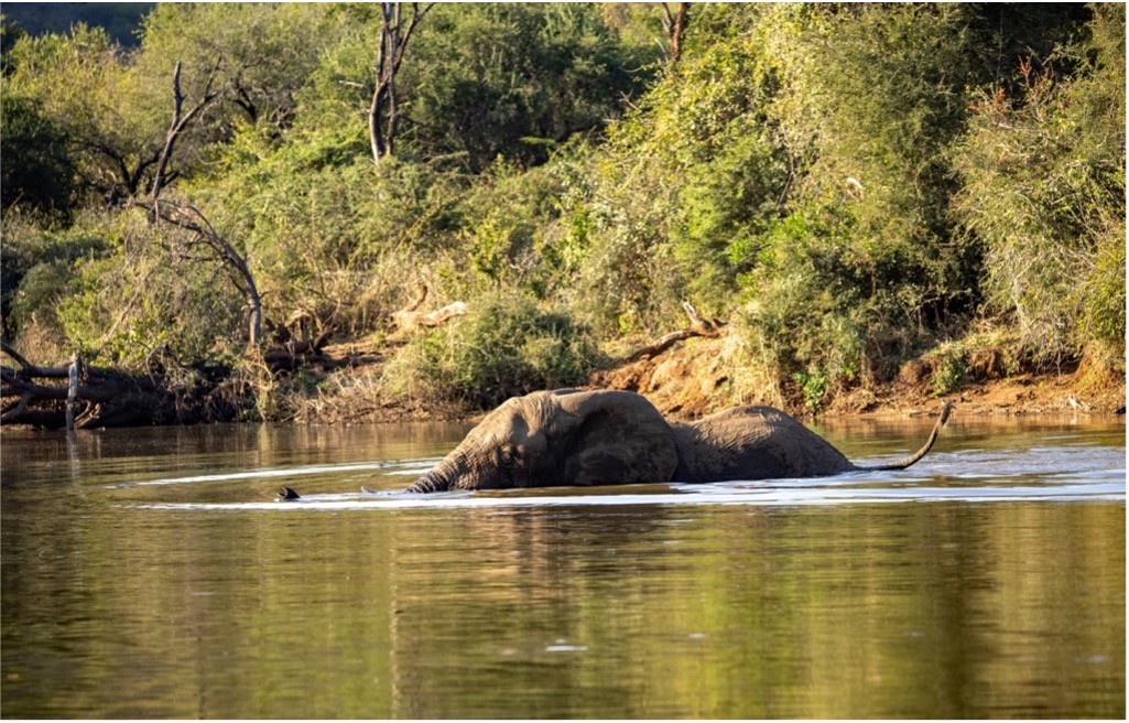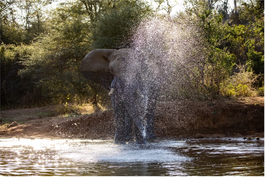 Then we witnessed an extraordinary event, certainly the first time I have seen this here – a bull elephant swimming across the river that flows into the dam, from one bank to the other. It was incredible to see him take to the water! At first he held his tail out the water but as he swam across it was just the tip of his trunk and the area above his eyeline that wasn’t submerged. He used his trunk like a snorkel, and his large body provided the buoyancy while his legs paddled beneath the surface. There was no reason for him to cross in front of us at that precise moment, but when he reached the other side he spun around a squirted a trunkful of water directly at us!