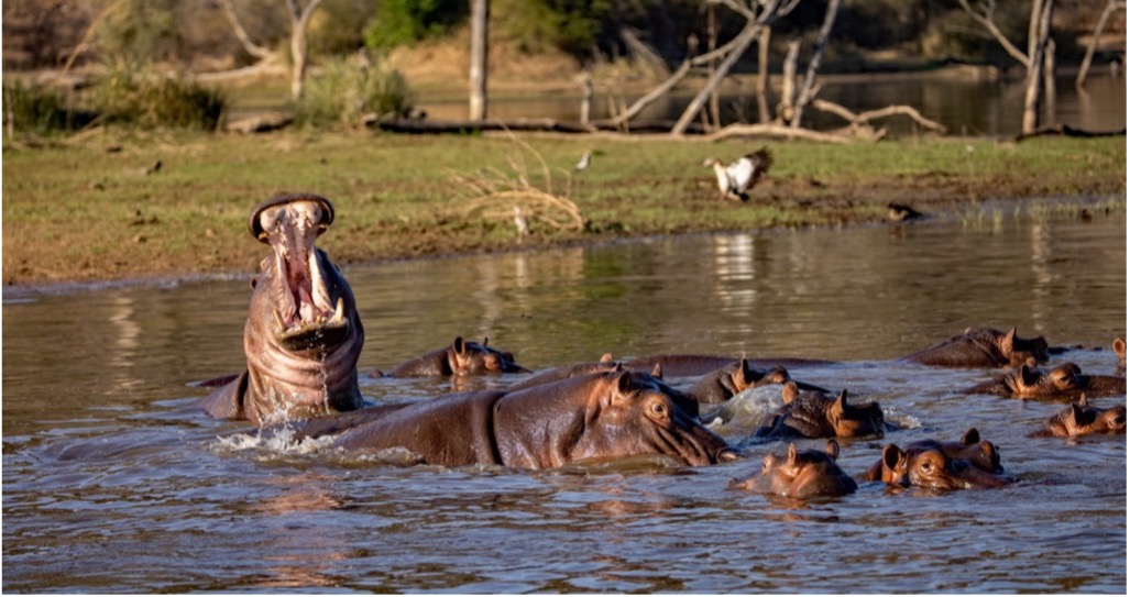 As we approached a pod of hippos individulas broke the surface, their wide nostrils puffing little bursts of mist into the amber air. Every few moments, one would “yawn” an enormous display of teeth, and trying to catch that moment on camera is a challenge.