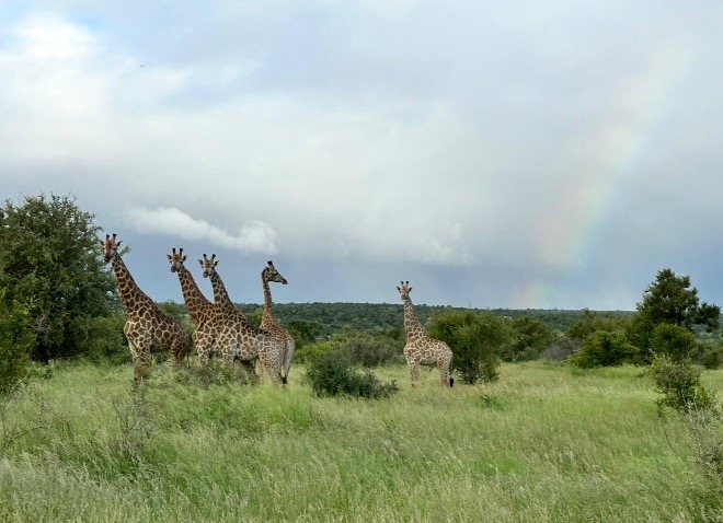 The edge of a rainbow rises above the Lebombo mountains as a tower of giraffe look on in the foreground.