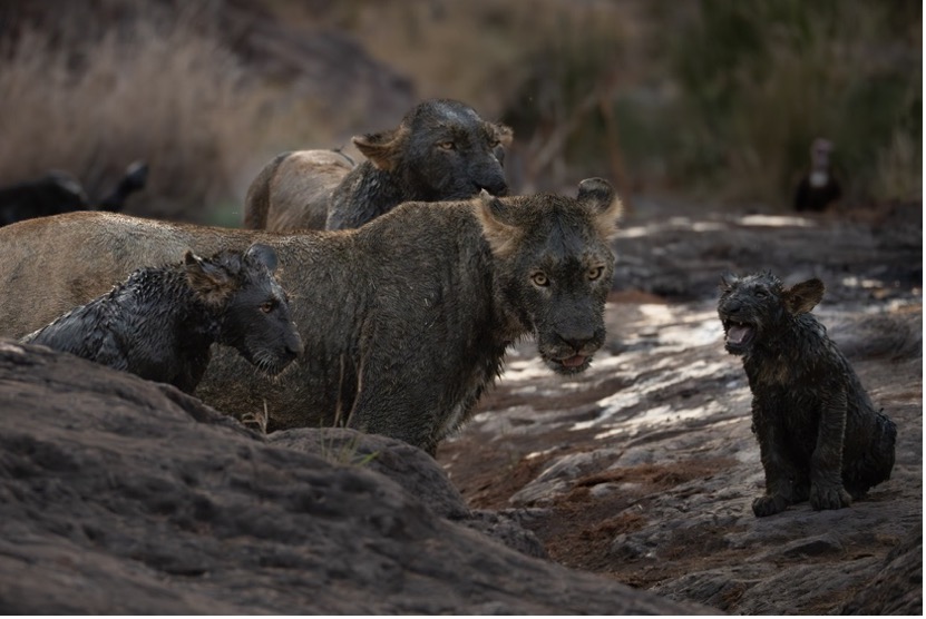 In October 2024, the Mananaga Pride ambushed an adolescent zebra at one of the last remaining waterholes, a shallow valley where the water lay stagnant and thick with mud. The young zebra lost its footing on the slick banks, and within moments the pride – nearly 15 strong – closed in. As they fed, the struggle for meat coated their tawny coats in dark, glistening mud. Only their piercing amber eyes shone through, making them look like black panthers in the fading light. It was a rare and unforgettable sight, and an extraordinary photographic opportunity.