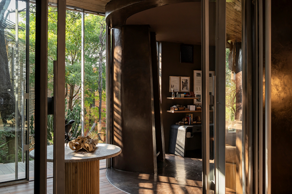 A new addition to the main lodge, as you enter Lebombo along the curved wooden walkway, is the Conservation Lounge and Gallery of Treasures – two spaces in one, both with an appreciation for nature: one artistic, and one informative. Designed to draw guests in, this is the physical and conceptual heart of the lodge, and a bridge between guests and the landscape. Elevating nature to art, and displaying art inspired by nature, it creates a conversation between conservation and design – serving to celebrate the lodge’s context and purpose.